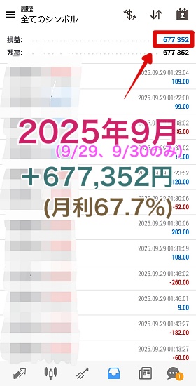 *2024年6月は、フォワード環境のMT4の問題もあって6月21日まで取得した成績となっています。MT4画像はありませんが、成績の2,456,521円は、第1週:942,871円/第2週:1,284,398円/第3週:229,252円の合計です。また翌月の7月までフォワード環境は稼働停止していましたので、7月の履歴はありません(8月途中から運用を再開)。