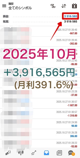 *2024年6月は、フォワード環境のMT4の問題もあって6月21日まで取得した成績となっています。MT4画像はありませんが、成績の2,456,521円は、第1週:942,871円/第2週:1,284,398円/第3週:229,252円の合計です。また翌月の7月までフォワード環境は稼働停止していましたので、7月の履歴はありません(8月途中から運用を再開)。